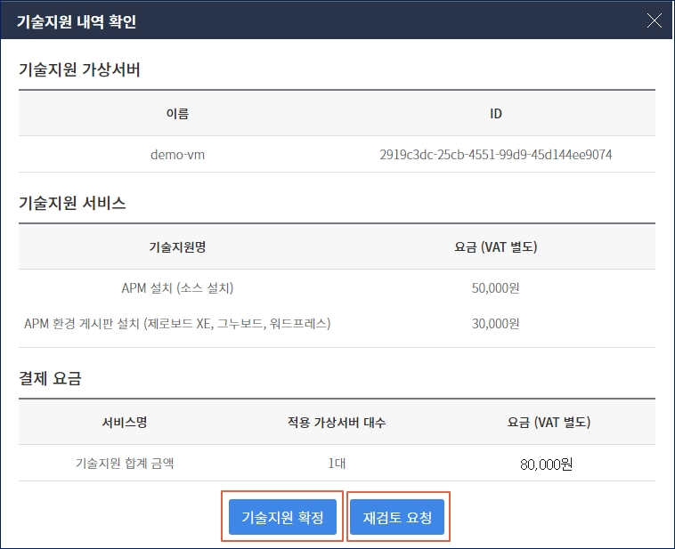 기술지원 비용은 가상서버 1개당, 1회 작업 분에 대한 비용이며, 서비스에 따라 익월 사용료로 청구됩니다.