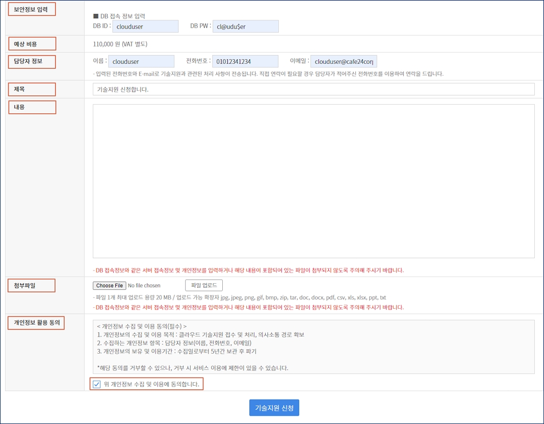 기술지원 신청 시에 기입해야 하는 항목은 아래와 같습니다.