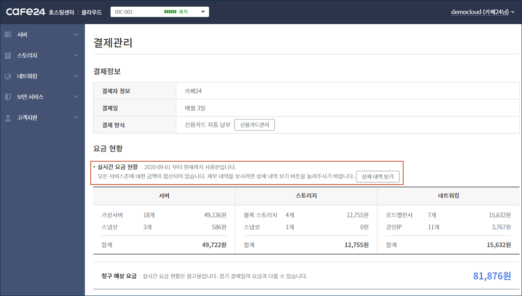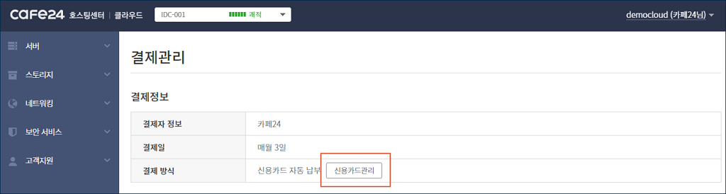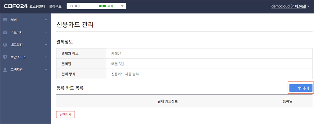 a. 카페24 클라우드 서비스는 후불제로 운영되며, 정기 결제를 지원하는 신용카드가 최소 1장 이상 등록되어 있어야 사용할 수 있습니다.