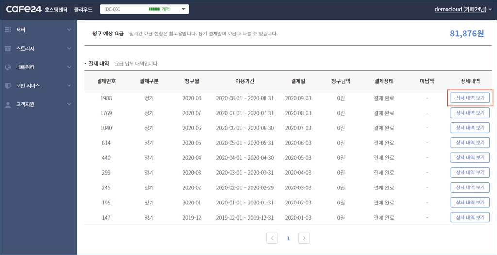 [상세 내역 보기] 버튼을 클릭하여 클라우드 서비스의 이용 대금 명세서를 확인할 수 있습니다.