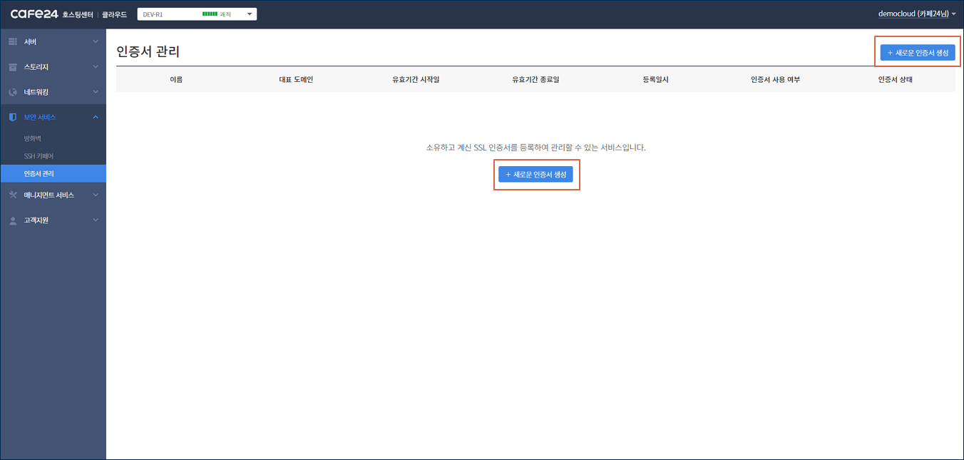 카페24 클라우드의 인증서 관리 서비스는 콘솔 내 로드밸런서 서비스에만 적용 가능합니다.