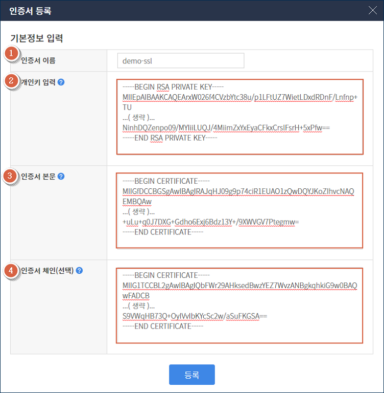 인증서 체인은 선택 사항으로, 보유한 인증서 체인이 있는 경우 붙여 넣습니다.