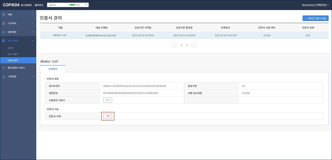 삭제할 인증서의 상세정보 탭에서 [삭제] 버튼을 클릭합니다.