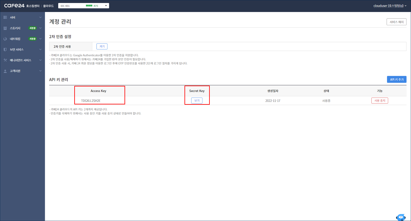 Secret Key를 확인하려면 [보기] 버튼을 클릭한 후, 클라우드 계정 패스워드를 입력하시면 확인할 수 있습니다.
