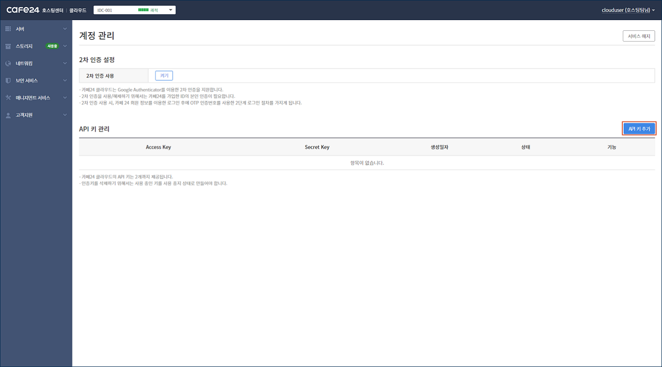 API를 통해 오브젝트 스토리지를 사용하기 위해서 API 키를 생성합니다.