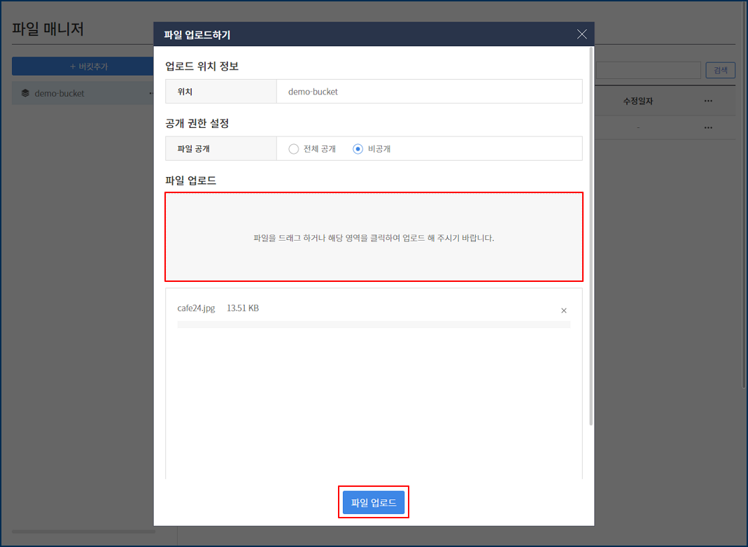 파일 매니저에서 [버킷추가] 버튼을 클릭합니다.