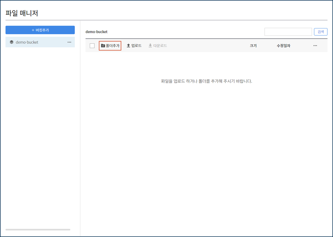 폴더를 생성할 버킷을 선택한 후, [폴더추가] 버튼을 클릭합니다.