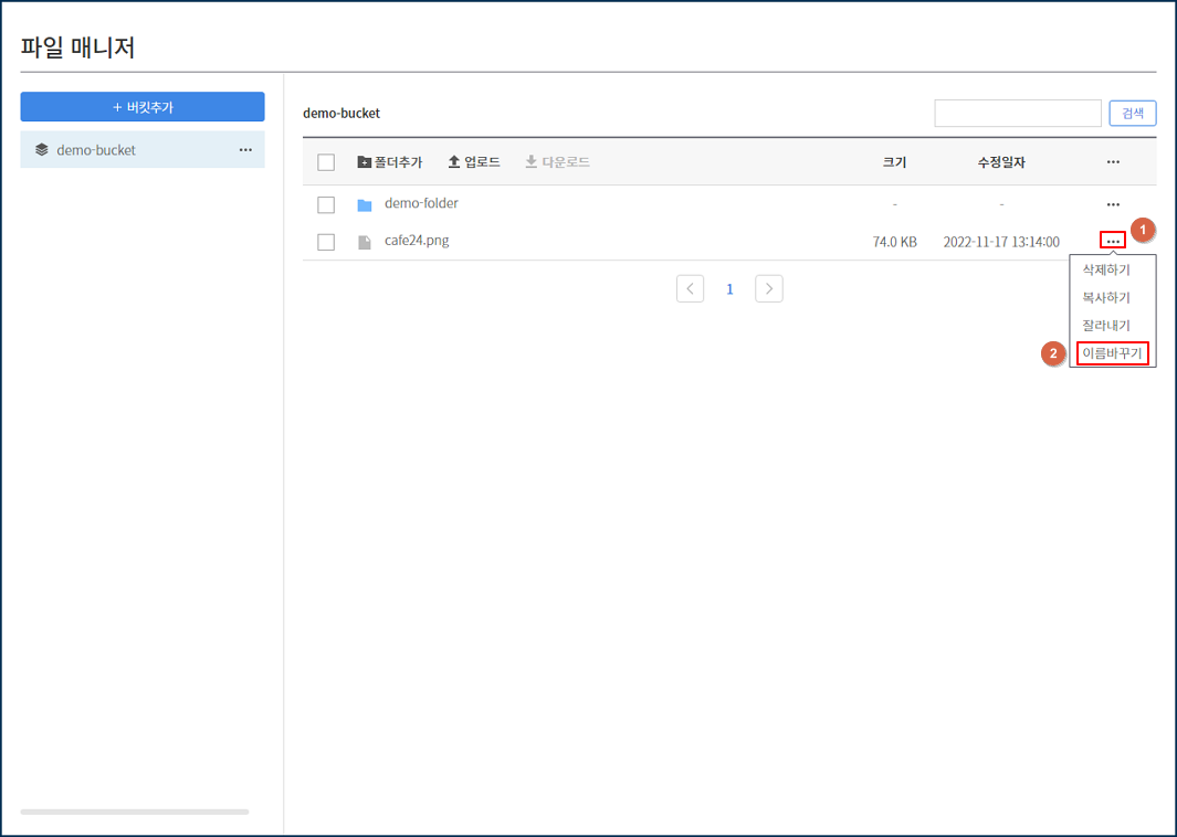 변경할 파일의 오른쪽 상세 메뉴를 클릭한 후, [이름바꾸기]를 선택하여 파일명을 변경할 수 있습니다.