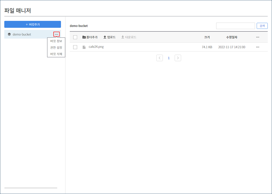 오브젝트 스토리지 기능에서 파일 매니저의 [관리] 버튼을 클릭하여 파일 매니저를 사용할 수 있습니다.