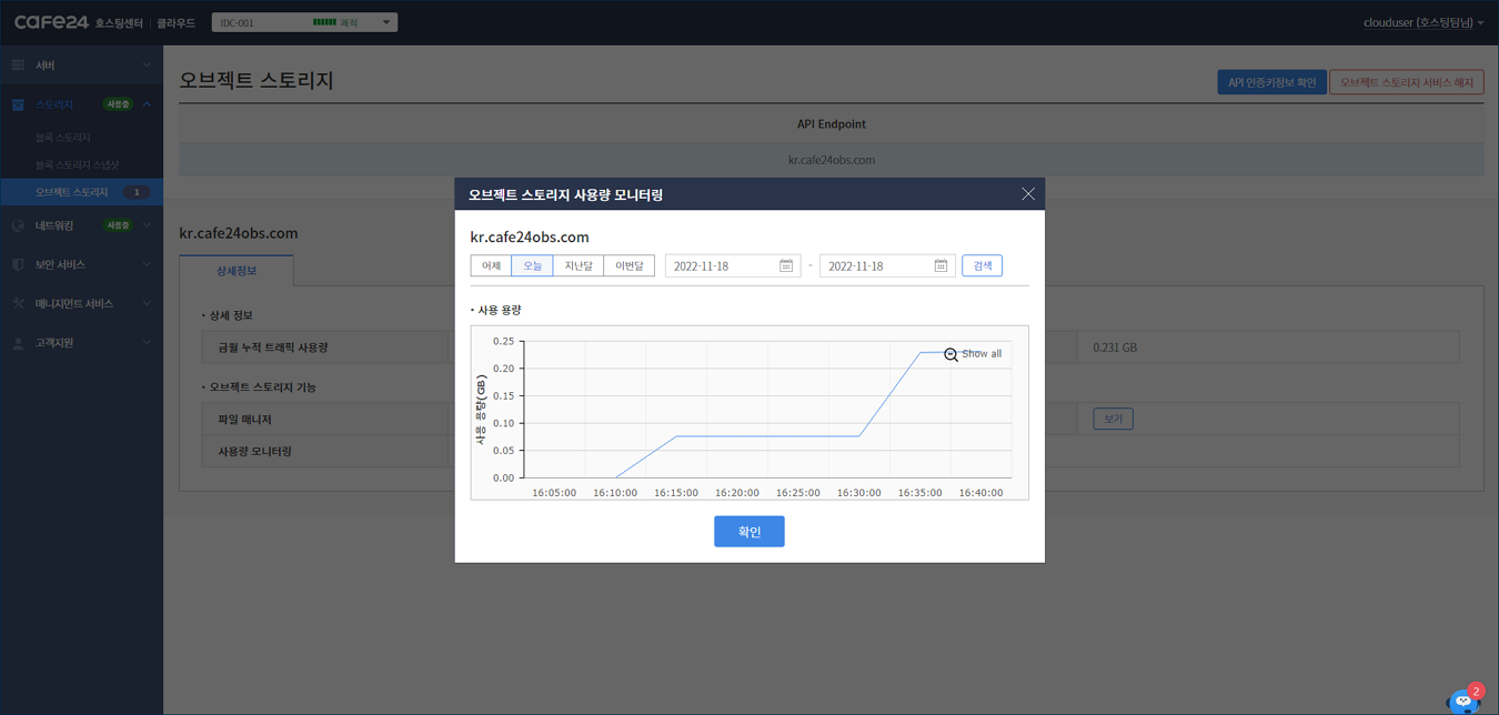 사용량 모니터링의 [보기] 버튼을 클릭하면, 오브젝트 스토리지의 사용 용량을 5분 단위로 기간을 조정하여 확인할 수 있습니다.
