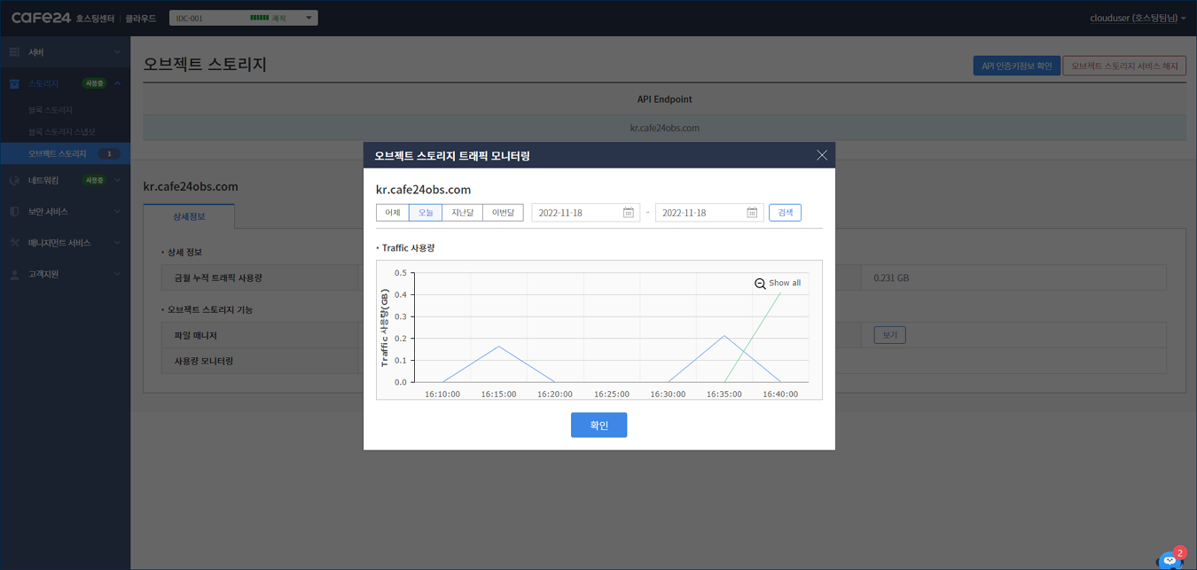 마찬가지로 트래픽 모니터링의 [보기] 버튼을 클릭하면, 오브젝트 스토리지에서 발생한 트래픽을 5분 단위로 기간을 조정하여 확인할 수 있습니다.